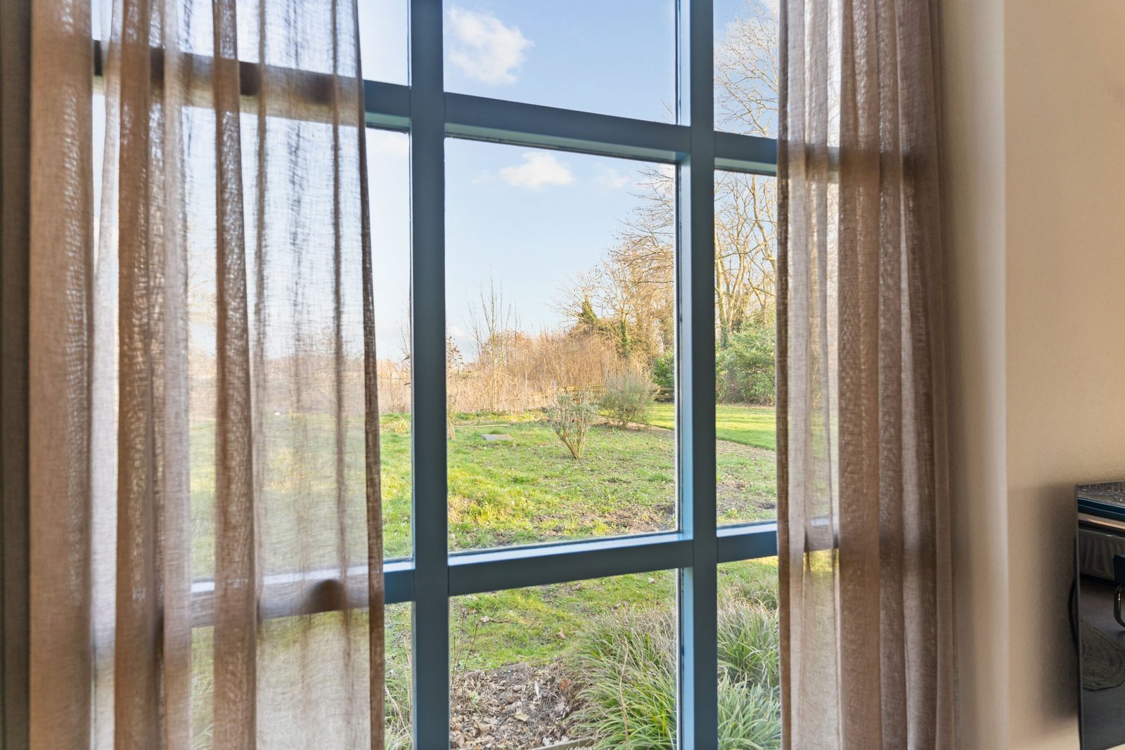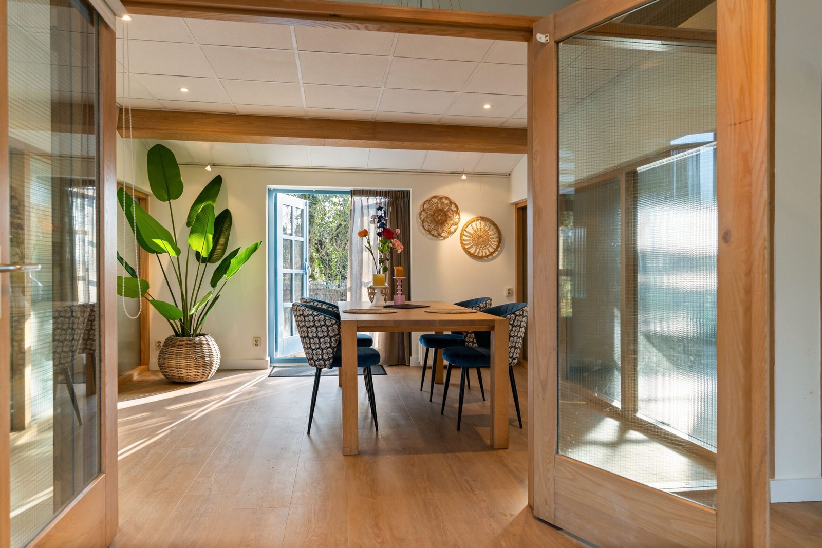 In de eetkamer staat een royale eettafel met uitzicht op de tuin. Een heerlijke plek voor lange ontbijten, spelletjesavonden of een goed glas wijn.