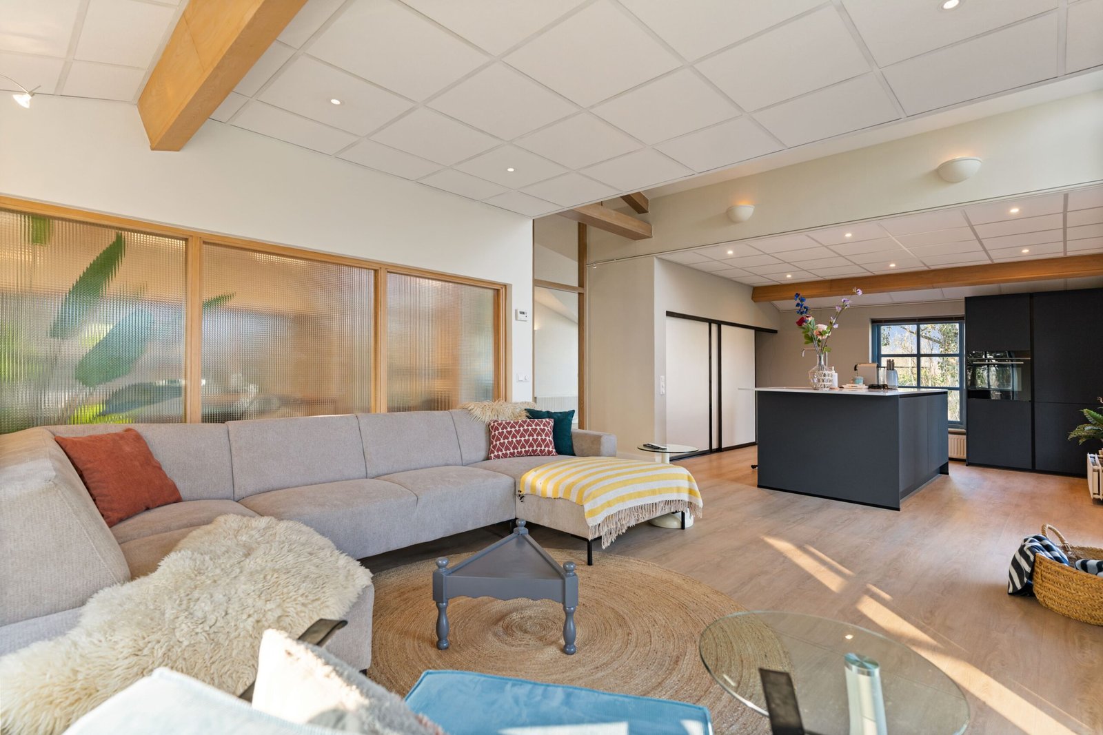 De ruime woonkamer is ingericht met een comfortabele hoekbank en smart-tv — ideaal voor ontspannen avonden. De grote leefkeuken biedt alle ruimte om uitgebreid te koken en samen te genieten van een maaltijd.