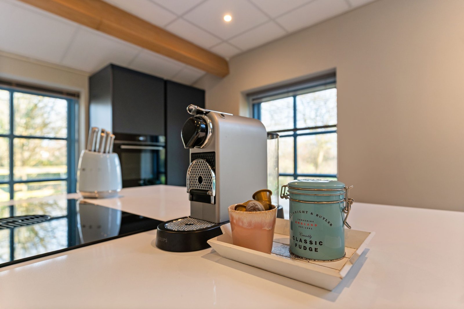 - Koelkast, vriezer, Nespresso-apparaat en kookbenodigdheden.