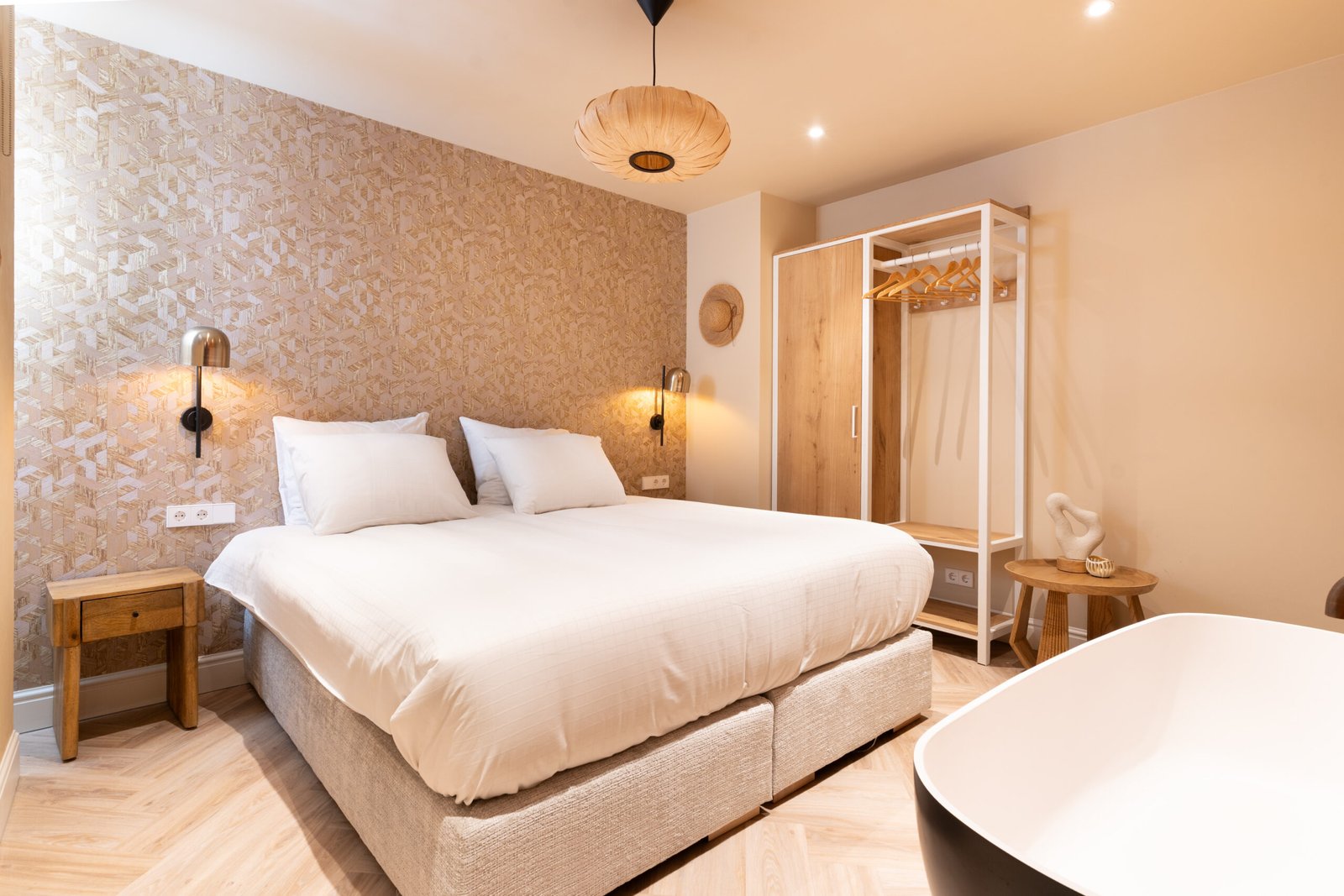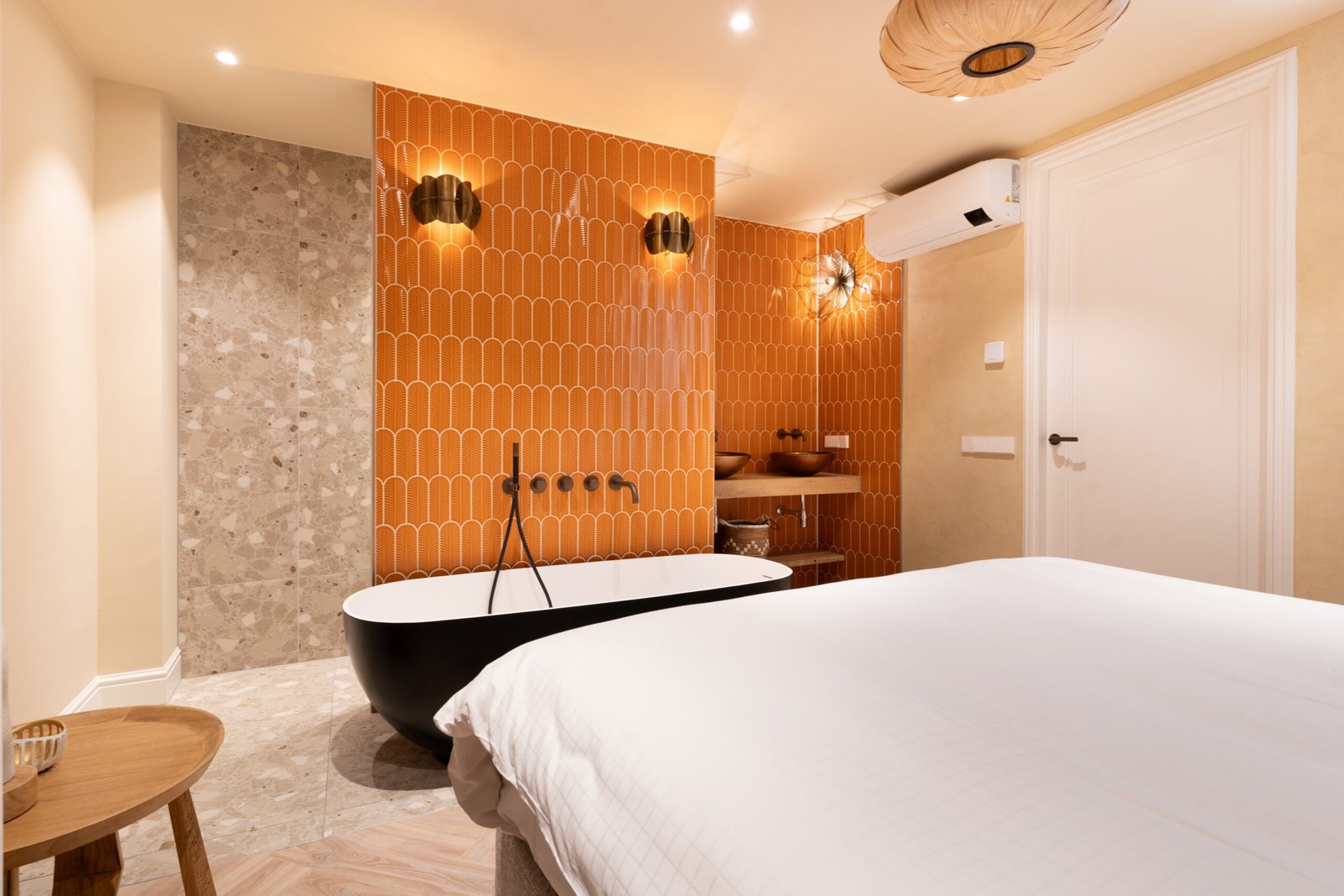 De grote slaapkamer biedt een heerlijke 2-persoons boxspring, airco en eigen badkamer. De badkamer is uitgerust met regendouche, losse douchekop, 2 wasbakken en een vrijstaand bad. In de badkamer is body- en hairwash aanwezig.