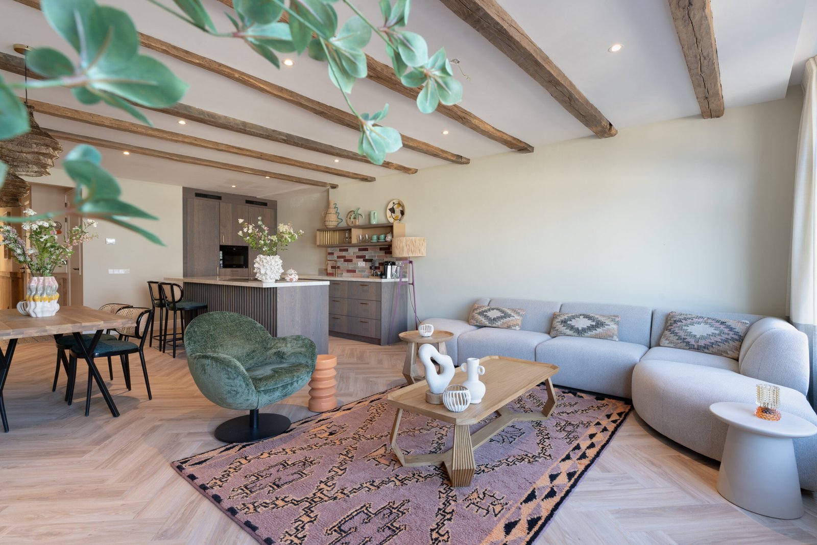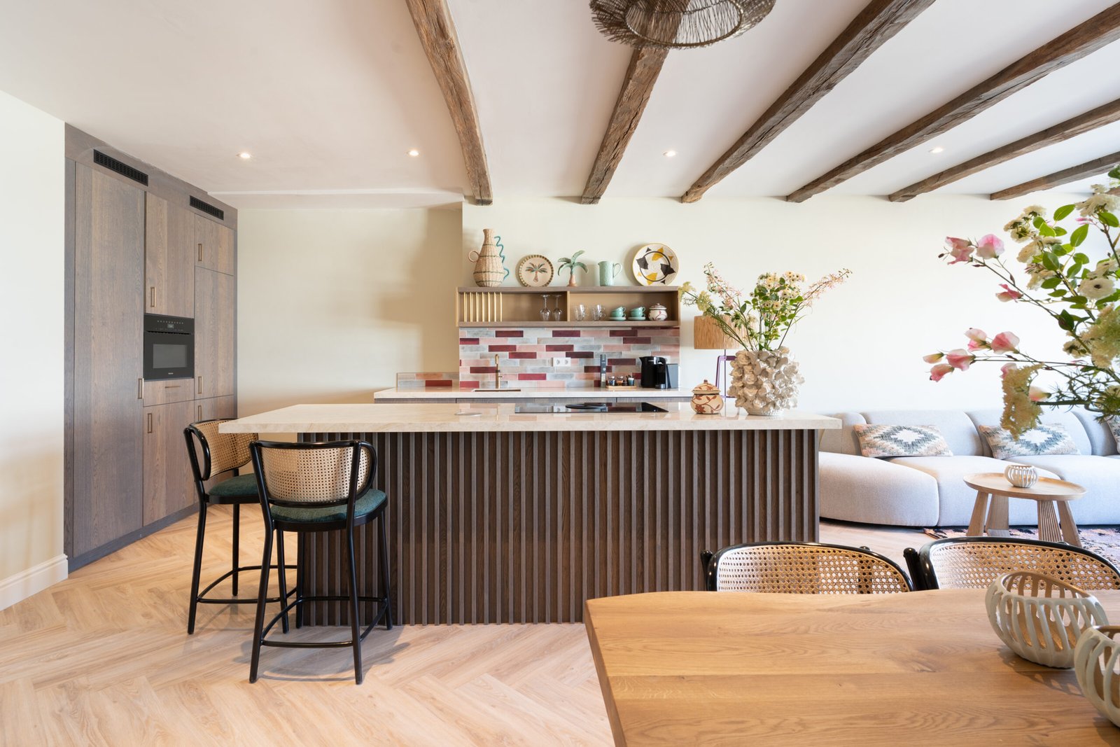 De woonkamer is uitgerust met een groot keukeneiland met quooker, combi-oven, elektrische kookplaat, nespresso koffiemachine en alle keukenaccessoires die nodig zijn om heerlijke maaltijden te bereiden. In de koffiecorner vindt u heerlijke koffie- en theeproducten van ontbijt- en lunchroom Anne&Max. De living en het eetgedeelte zijn zeer ruim opgezet en voorzien van prachtige kleurencombinaties en karaktervolle details.