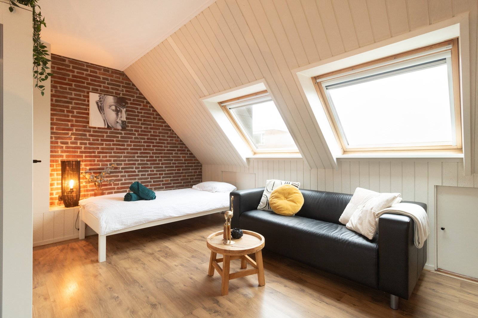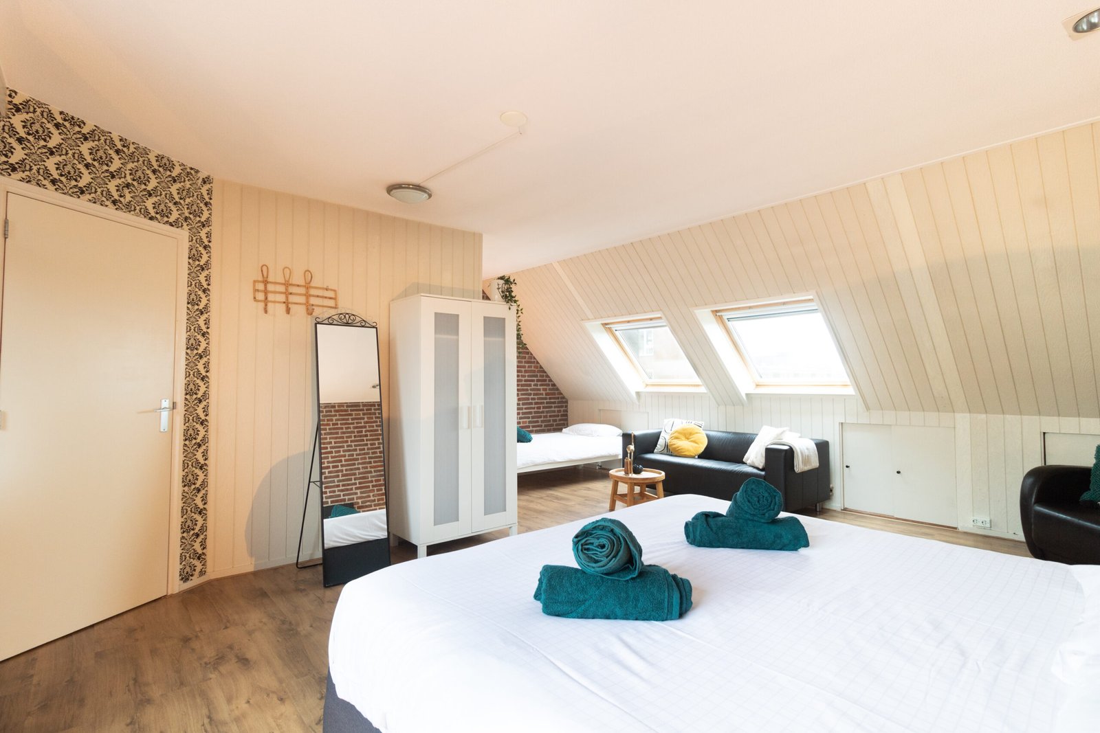 De grote slaapkamer beschikt over 2 luxe bedden die plek biedt aan 3 personen. 1 tweepersoons kingsize boxspring (180/200cm) en een 1 persoons bed (90/200cm). Verder is er een kledingkast, een spiegel en zitruimte aanwezig in de slaapkamer. De slaapkamer biedt exclusief toegang naar het derde balkon en is ingericht met heerlijke zitjes.